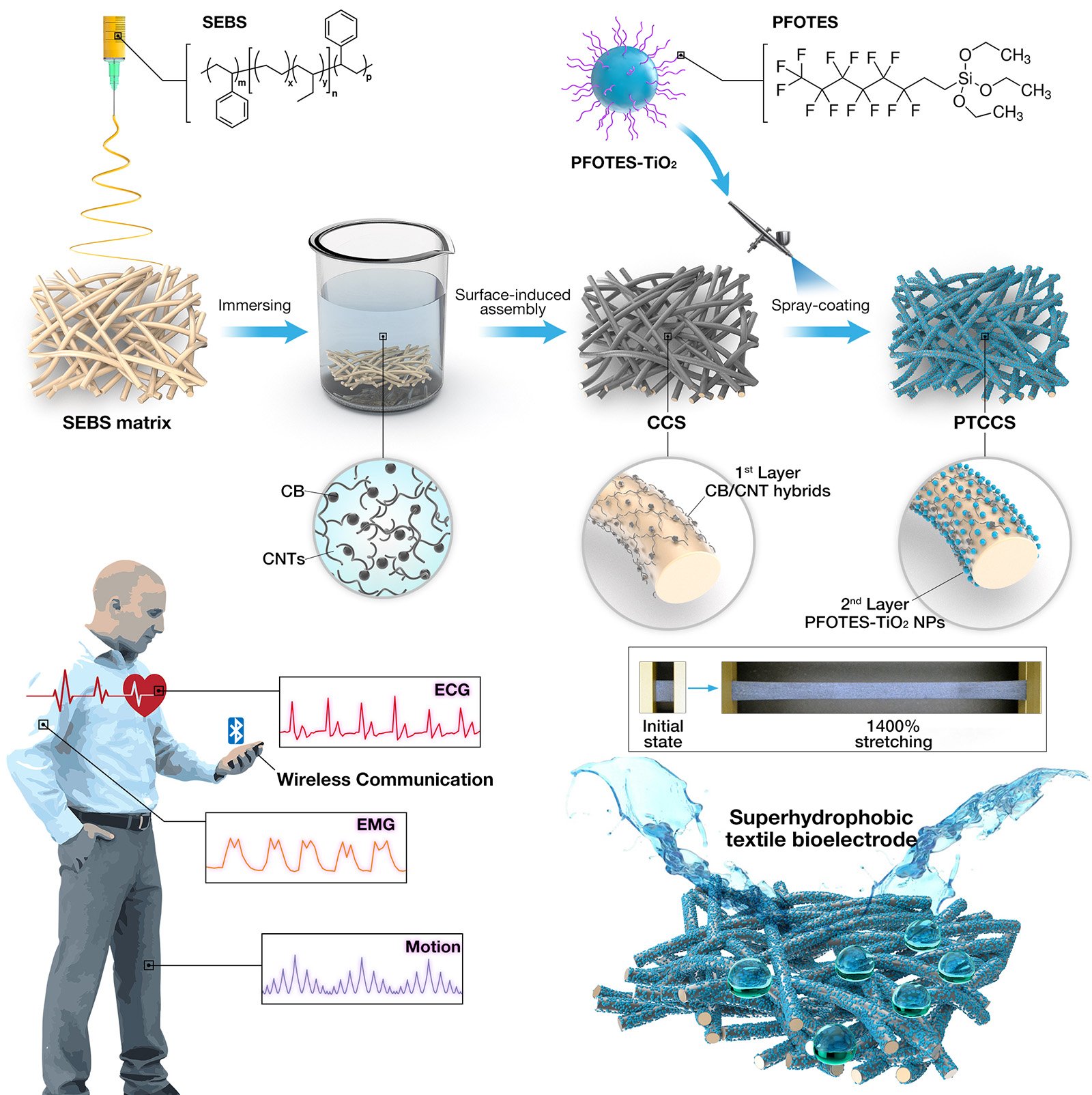自清洁、超可拉伸织物基表皮电极的设计示意图