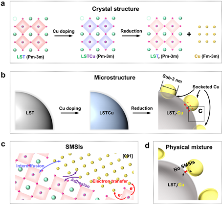 掺杂在钙钛矿母体(LST)里Ti位的Cu,在氢气气氛中,高温还原之后完全转变为0价Cu,原来的单一体相转变为LSTr和Cu相;随着体相中的Cu不断地被还原,Cu逐渐的外延生长到钙钛矿母体的表面,形成了3 nm左右的球状颗粒,产生了LSTr-Cu异质结;LSTr母体和纳米Cu之间存在着强相互作用(SMSIs),强化了LSTr和纳米Cu之间的相互扩散,使纳米Cu和LSTr紧密的锚定在一起,提高了对纳米Cu表面结构降解的抵抗能力,界面间的电荷转移优化了异质结的电子结构。
