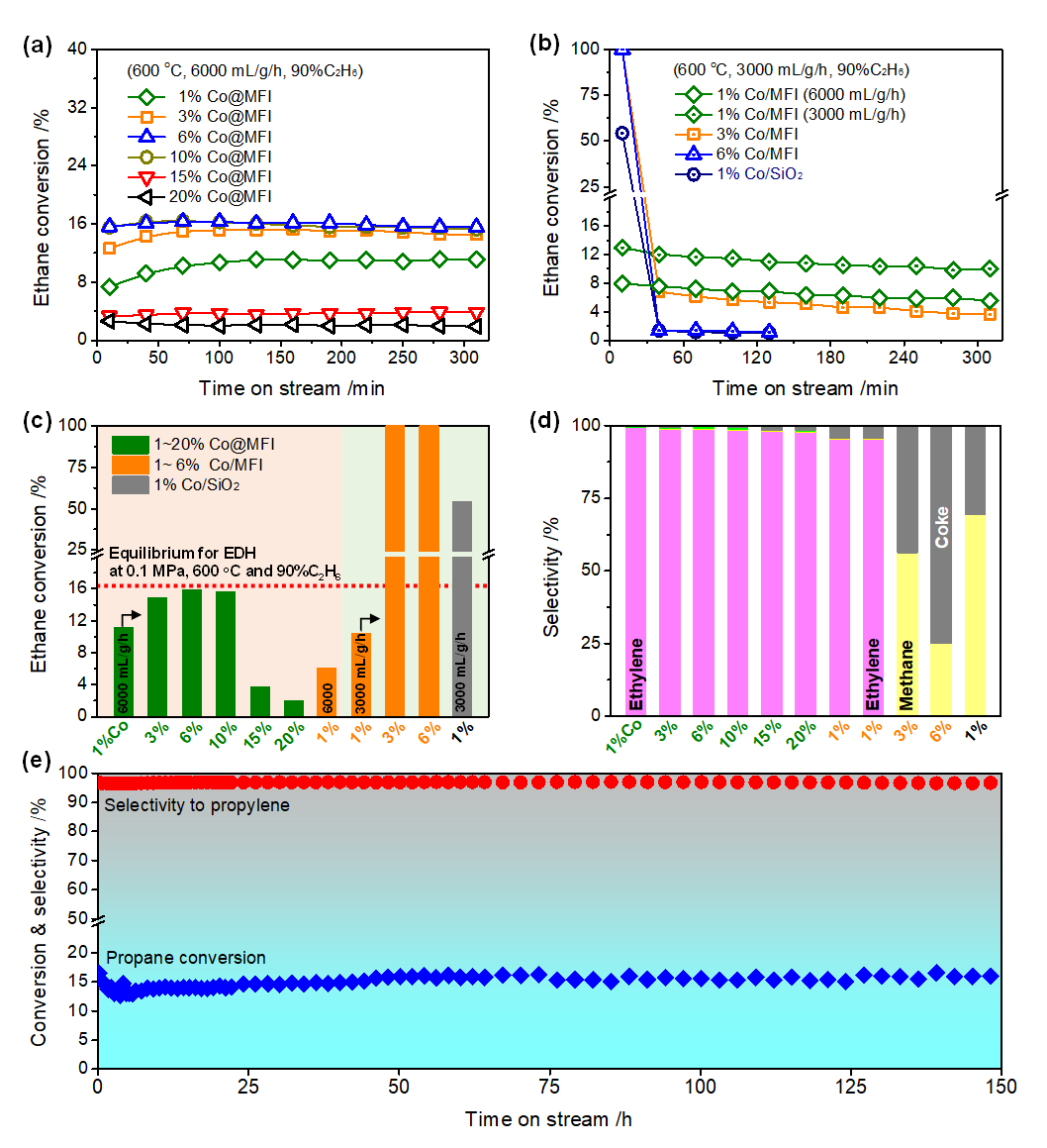近期,我校刘小浩团队采用一锅法,在无铝环境(即不依赖B酸位点),无需添加配位试剂的条件下一步成功合成了载量高度可调(1~10 wt% Co)的原子级分散Co@MFI催化剂,实现了乙烷在苛刻反应条件下(高乙烷浓度,高反应空速)以平衡转化率、近100%选择性无氧脱氢制乙烯,并表现出优异的催化稳定性。同时,该催化剂也适用丙烷无氧脱氢高效制丙烯,获得近100%丙烯选择性,催化剂稳定运行150 h无任何失活。