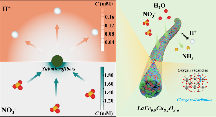 基于此,本团队受Haber-Bosch催化剂和固氮酶中Fe活性位点的启发,报道了一种具有高效电催化合成NH3性能的钙钛矿型电催化剂。利用B位阳离子替换策略构建了一系列富氧空位的钙钛矿氧化物LaFe0.9M0.1O3-δ(其中M为Co、Ni和Cu)亚微米纤维(简称为LF0.9Co0.1、LF0.9Ni0.1和LF0.9Cu0.1亚微米纤维)。例如,LF0.9Cu0.1亚微米纤维表面存在非均匀电荷再分布和丰富的氧空位,以及更正的表面电势和较低的功函数,这些特性共同作用使得该纤维能够增强对NO3-离子的吸附能力。同时,通过构建具有更正的表面电势的催化剂,有利于解决由于传质能力弱和电极区域浓度梯度小而导致的低活性问题。因此,LF0.9Cu0.1亚微米纤维展现出了最佳的NH3产率和法拉第效率。结合COMSOL Multiphysics模拟和原位表征以及第一性原理计算发现,通过Cu在B位上的取代,成功降低了控速步的势垒,从而促进了反应的进行。这一研究揭示了Cu取代在该反应中的重要作用,为研究钙钛矿型电催化合成NH3催化剂的设计和开发提供了新的思路。