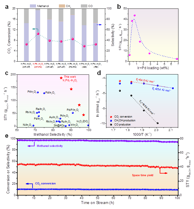 实验结果表明:采用这种光诱导靶向邻近沉积策略,在ln2O3上精确合成双原子Ir1Pd1位点用于CO2加氢制甲醇,双原子位点之间的协同催化作用显著提高了CO2转化率(10.5%)和甲醇选择性(97%),实现了破纪录的甲醇时空产率(187.1 gMeOH·gmetal-1·h-1),且活性位点与ln2O3载体之间存在合金效应,导致该催化剂具有良好的催化稳定性。