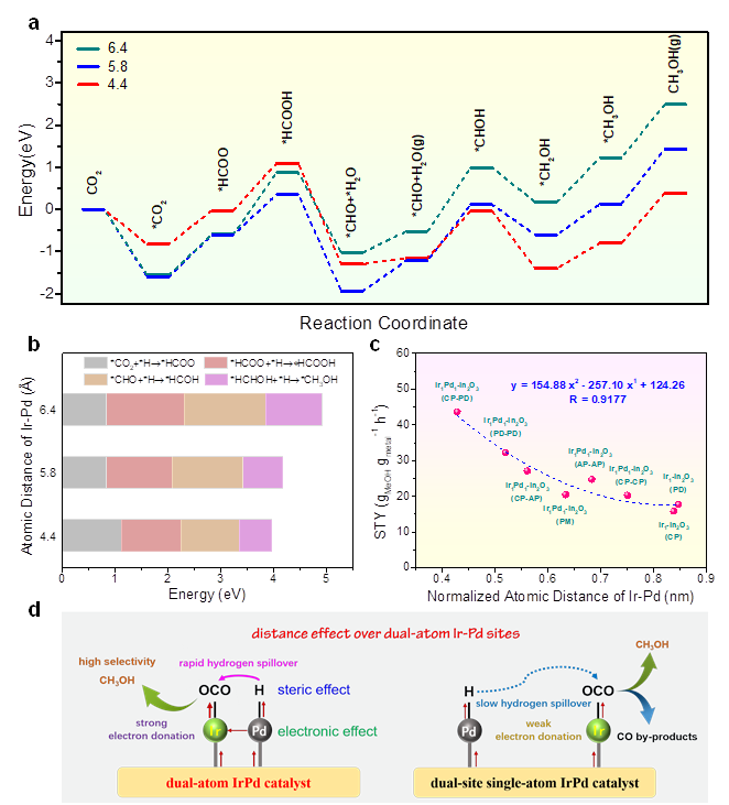 刘小浩教授团队首次采用单原子铱负载的氧化铟作为前驱体,紫外光作为驱动力,激发产生光电子富集在铱原子周围,从而实现在埃米尺度上诱导异核金属钯原子靶向定位形成均一双原子铱钯位点。铱位点主要强化二氧化碳的活化以及中间体一氧化碳吸附,而钯位点则有利于氢气解离。通过该设计策略合成的邻近铱钯位点具有最优的距离和电子协同效应,可以获得埃米尺度范围的快速氢转移和钯供电子给铱,从而最大程度加速二氧化碳吸附、活化以及多步加氢过程,导致经*HCOO途径生成甲醇具有更低的能垒,实现高活性、高选择性制甲醇。