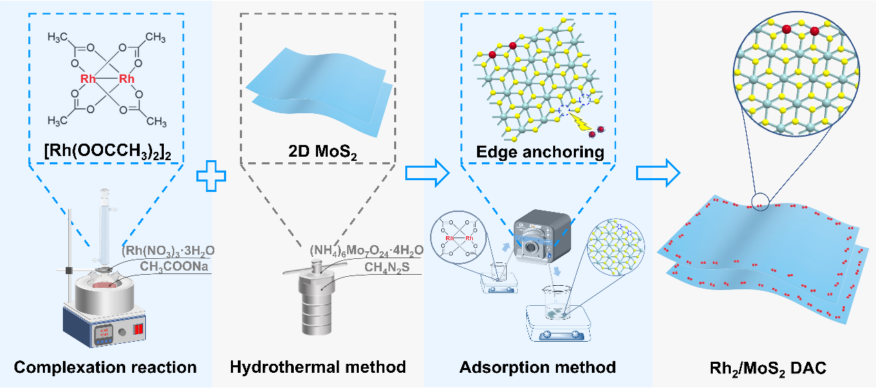图1. Rh2/MoS2DAC合成路线和模型的示意图。