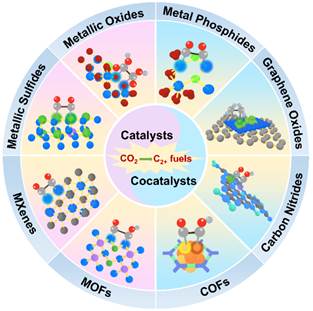 图1.在不同的材料光催化CO2制C2+产物,其中金属氧化物、金属硫化物、MXenes、MOFs作为催化剂,COFs、C3N4、金属磷化物和石墨烯作为助催化剂,促进C−C耦合。