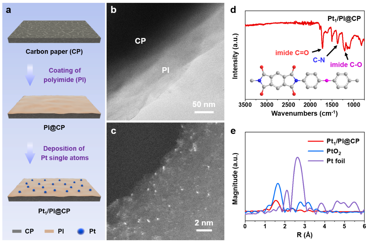 图1:铂单原子/聚酰亚胺复合催化剂的制备流程和结构表征结果