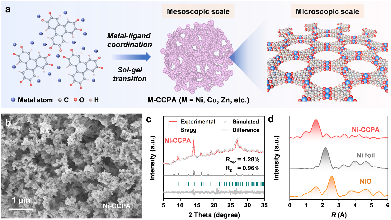 针对上述问题,我们提出了诱导交联-配位组装技术制备共轭配位聚合物气凝胶材料的新策略(图1),其充分发挥了共轭配位聚合物材料和气凝胶材料的结构优势。一方面,精准设计金属原子的种类和共轭有机配体的官能团/共轭结构,可实现共轭配位聚合物气凝胶催化剂中金属单原子活性位点配位结构的精准调控;另一方面,共轭配位聚合物气凝胶催化剂具有多级孔结构,可充分暴露金属单原子活性位点,并利用孔富集效应来提高金属单原子活性位点表面的局部反应物浓度,从而实现催化反应动力学的提升。该策略具有良好的普适性,可成功合成以镍、铜,锌等金属单原子为活性中心的共轭配位聚合物气凝胶,有望为开发高性能的金属单原子催化剂提供有益借鉴。