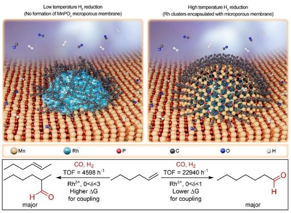 刘小浩教授团队采用浸渍法将乙酰丙酮铑负载到Mn2P2O7载体上,基于可控H2还原触发载体中的磷(P)活化,从而实现了MnPOx物种向Rh团簇表面的定向迁移,形成的MnPOx微孔膜(孔尺寸1.5-2.5nm,膜厚度大约1.5nm)可以同时调控Rh活性位点的电子性质与空间位阻影响,进而显著提升1-己烯氢甲酰化反应性能。
