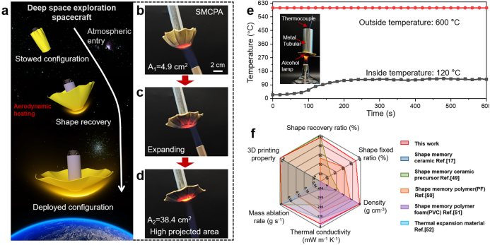 针对上述问题,研究团队提出一种形状记忆可陶瓷化聚合物气凝胶(SMCPA),该材料协同整合了超低密度、优异的形状记忆性能与高温热防护能力。SMCPA以聚酰亚胺-聚硅氧烷共聚物为气凝胶基体,并引入功能性无机填料增强。在该体系中,聚硅氧烷具有双重作用:一方面作为可逆相赋予材料优异的形状记忆性能,另一方面作为陶瓷前驱体,在高温下SiO2与功能性填料协同发生原位转化。这种原位陶瓷化过程显著提升了材料的抗烧蚀性能,在1.5 MW·m-2热流密度下,其质量烧蚀率仅为0.012 ± 0.003 g·s-1。得益于气凝胶的高孔隙三维结构,SMCPA展现出超低密度(0.12 ± 0.02 g·cm-3)与优异的隔热性能(室温下热导率为0.055 ± 0.001 W·m-1·k-1),突破了传统热防护材料在密度与防护性能之间的权衡难题。同时,SMCPA的热响应特性使其可通过气动加热触发形状恢复,实现防护结构的自主展开。实验结果表明,展开后材料的有效受热面积提升680 %,这一特性对增强大气再入过程中的减速效率与有效载荷能力具有重要工程价值,为下一代可展开热防护系统与高温热防护领域提供了新方案。