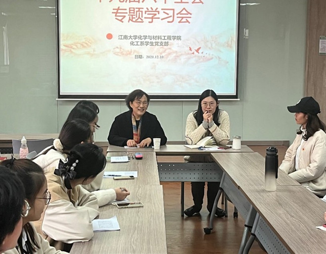 化工系学生党支部于12月10日在化工楼A316会议室开展专题学习。本次活动特邀请刘玉老师莅临指导,支部书记杨璇及支部全体党员参与学习。