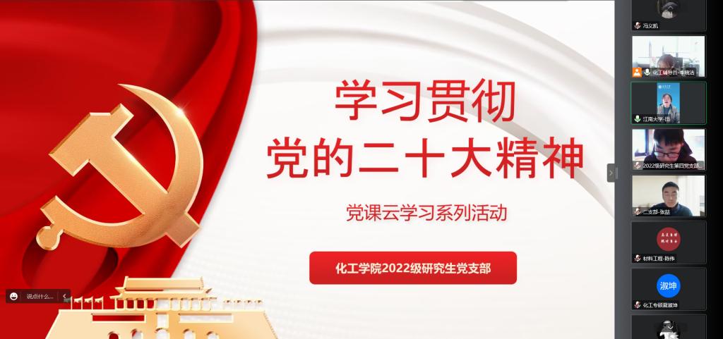 活动伊始,学院党委副书记田卫平为活动致辞,她强调了学习贯彻党的二十大精神的必要性与重要性,鼓励同学们从多角度、多层次、多渠道进行学习。随后,各个支部代表立足于党的二十大报告原文分别从不同角度与党员同志们分享了自己的学习成果。第一支部代表陈依梅以“学习贯彻党的二十大精神,深刻理解中国式现代化的科学内涵”为题,结合中国国情和社会发展的规律和特点,全面阐释了中国式现代化的中国特色、本质要求和重大原则等中国式现代化的重要内核。“为青年党员指明了前进方向”“要怀抱梦想又脚踏实地,敢想敢为又善作善成”……对于党的二十大报告中关于青年工作的重要论述,第二支部代表张喆同志和第三支部代表孙慧敏同志分别以“学习贯彻党的二十大,做新时代合格党员”“学习党的二十大,争做时代青年”为主题,从理论基础,个人理解,青年榜样,名人寄语等方面引领化工青年奋发向上,主动作为,在建设现代版富春山居图的奋斗征程中展现化工材子的精神风貌。在理论学习方面,第四支部代表徐罡以“学习贯彻党的二十大精神——开辟马克思主义中国化时代化新境界”为题,分享了作为新时代青年如何将马克思主义基本原理同中国具体实际相结合、同中华优秀传统文化相结合。其他几位代表也根据自己对理论的理解与学习分享了自己的感悟,在云课堂上,大家积极分享交流,研讨谈感悟,争做新青年。