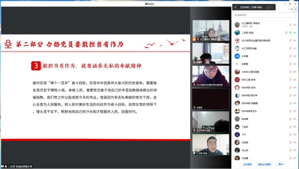 最后,李晓洁宣布活动结束,呼吁各支部将党课云学习系列活动继续进行下去,各支部党员自发接力,通过微党课、微诵读等形式,在自学的基础上,以党支部为单位集体研学,边学边讲。通过“党员轮流讲带动全体党员学”的方式持续推进,全体党员及入党积极分予以端正学习态度,在党史的学习教育中,从党的百年风雨兼程中汲取砥砺前行的智慧和力量。