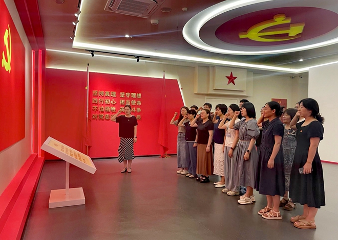 延安,中国革命的圣地,十三载峥嵘岁月,孕育了永放光芒的延安精神。作为中国共产党人的精神谱系中最具代表性的重要精神之一,延安精神则是中国共产党伟大建党精神在延安时期的结晶。党员们教师们参观了延安精神展示馆,再次重温了实事求是、理论联系实际、全心全意为人民服务和自力更生艰苦奋斗的延安精神。当党员教师们站在由多媒体手段复原的壶口瀑布前,滚滚江水如万马奔腾,耳边响起《黄河大合唱》的嘹亮歌声时,大家仿佛来到了陕北的红色热土,感受着中华儿女不屈不挠、保家卫国的信心与决心。延安时期是我们党领导的中国革命事业从低潮走向高潮、实现历史性转折的时期。在解说员的解说引导下,在一份份文件、一件件实物、一幕幕实景、一段段表演前感受历史、淬炼精神,深刻体悟了红色延安的感人故事,感受了共产党人的精神追求。最后,在行政党支部书记张青的带领下,在鲜红的党旗前,全体党员一起重温了入党誓词,以铿锵有力的誓言表达接续奋斗的坚定信念。
