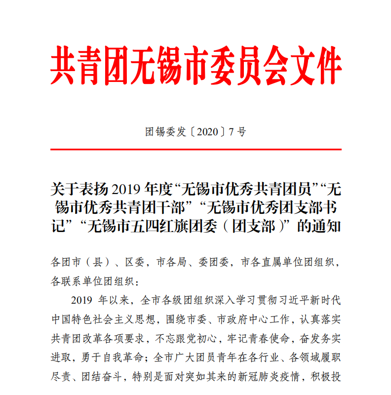 近日,共青团无锡市委员会发布《共青团无锡市委员会关于表扬2019年度“无锡市优秀共青团员”“无锡市优秀共青团干部”“无锡市优秀团支部书记”“无锡市五四红旗团委(团支部)”的通知》,共青团百合动漫