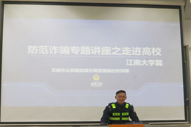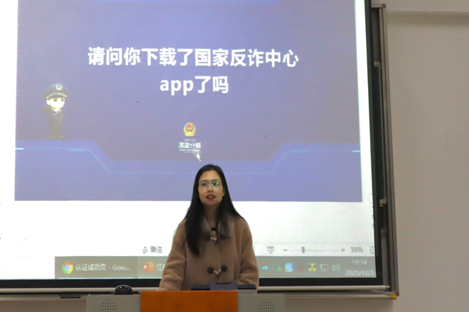 于12月5日在第二教学楼2A127教室开展面向2021级全体同学的安全教育专题讲座。此次讲座由2021级辅导员郝林青主持,并邀请无锡市公安局滨湖分局雪浪派出所的刘啸警官对防诈骗相关问题进行讲解。