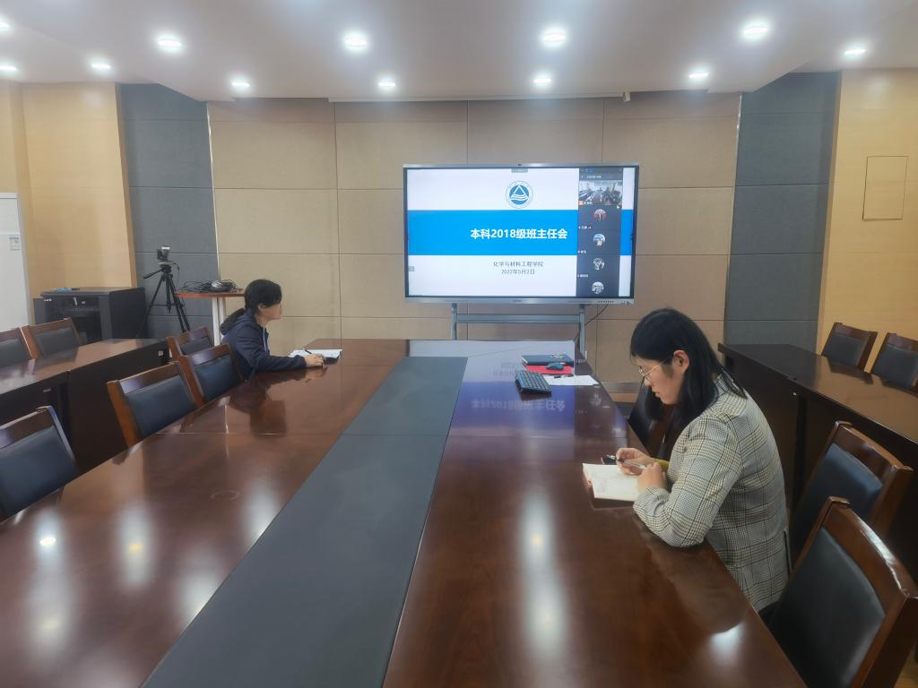 在A310会议室召开本科2018级班主任工作会议,学院党委副书记副院长田卫平、化工1802班班主任杨璇线下参加会议,其余所有班主任因疫情防控在线上参加会议。
