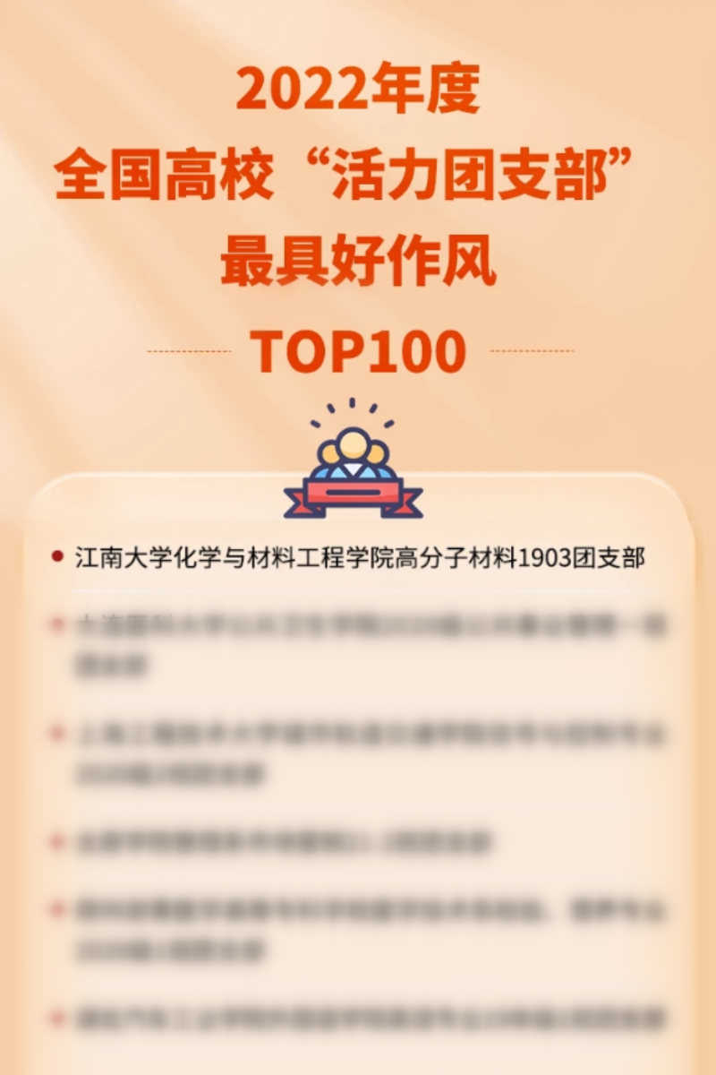 为深入贯彻“全团抓思想政治引领”“全团大抓基层”“全团抓学校”工作部署,落实《关于改革创新高校共青团工作 切实增强思想政治引领实效的若干措施》,激发高校团支部活力,团中央基层建设部指导中国青年报社开展了2022年度高校“活力团支部”风采展示活动,百合动漫 高分子材料1903团支部经过校内选树、校级展示、省级展示、全国展示等环节,成功入选2022年度全国高校“活力团支部”风采展示活动,经过后期评比,荣登《2022年度全国高校“活力团支部”最具好作风TOP100榜》。