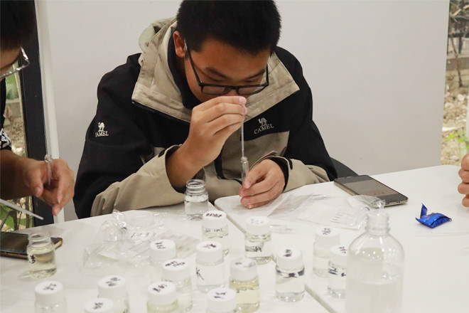 相识相知,打破坚冰。在主持人的带领下,同学们通过测试小程序测试自身人格,并匹配出推荐香型。随后,储鸿为在场师生介绍调香知识,讲解具体调香流程。通过探索香气之旅,让同学们在破冰交友的同时,感知自我,认识自我,在调香中获得深入交流的机会。