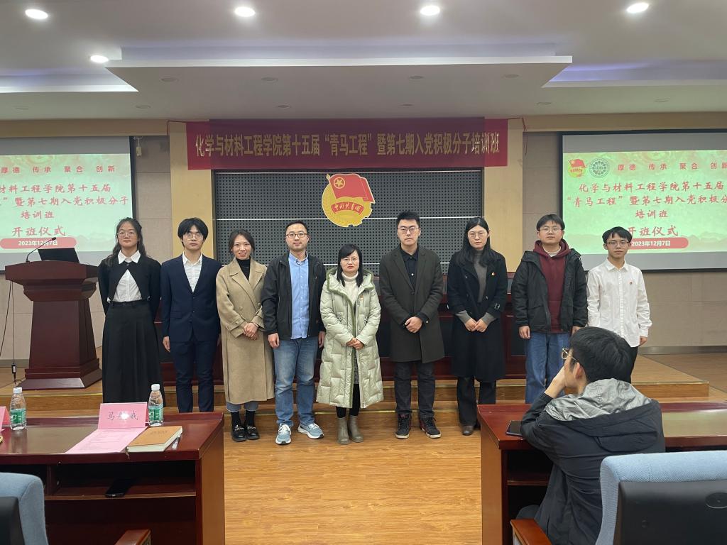 第十五届“青马工程”暨第七期入党积极分子培训班开班仪式在化工楼B329会议室顺利举行。学院党委副书记、副院长董霞,马克思主义学院副教授、校团委挂职副书记孙晨光,学工办主任兼分团委书记鞠峰,学工办副主任侯玉莹,2022级本科生辅导员杨璇,2023级本科生辅导员马航威,第十五届“青马工程”及第七期入党积极分子培训班学员150余人参加本次活动,活动由分团委学生副书记高持恒主持。