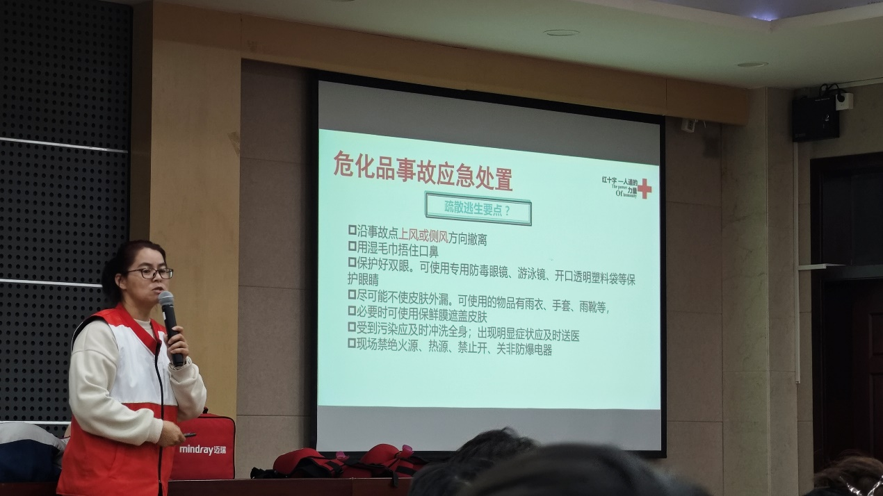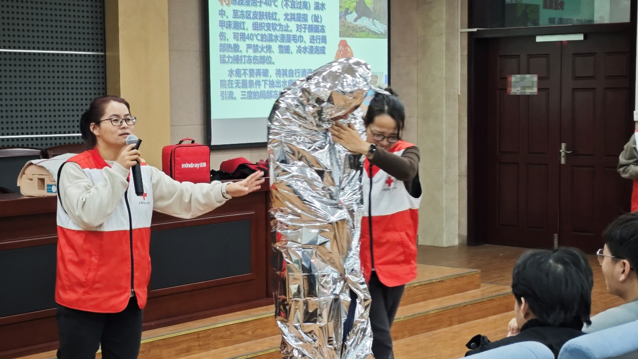 此次讲座特邀了红十字会救护培训师、无锡市红十字赈济救援队副队长唐镇棣主讲,红十字会救护培训师蒋小燕、助教老师顾瑾现场协助。讲座通过对急救知识的讲解、急救情况视频播放和现场带领学生实际演练等方式,全面介绍了救护相关法律法规、应急救护流程以及日常意外和急症的救护原则。