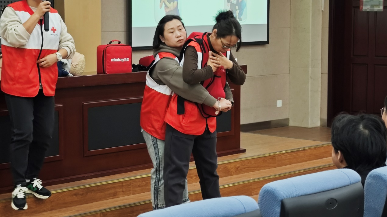 的学生来说,未来可能从事与化学品、实验室操作或者工业生产相关的工作,更需要具备基本的急救知识。接下来唐镇棣老师主要从晕倒、异物梗阻、心肺复苏三个方面进行急救知识理论与实操的讲授。首先,针对晕倒突发情况,唐镇棣老师向现场同学展示了如何正确对患者翻身并打开其气道的方法。接着,针对气道异物梗阻的突发情况,两位协助老师进行了海姆立克急救法的实际演示并带领现场同学们进行练习,使每位参与者都能够熟练掌握相应技能。最后,唐镇棣老师聚焦于心肺复苏方法(CPR),向现场同学讲解了如何在有效的抢救时间内对呼吸心跳骤停的患者进行应急救护,借用人体模型生动形象地介绍了自动体外除颤器(AED)的使用方法,并与两位协助老师进行了实操演练教学。将理论知识与技能实操结合,通俗易懂,生动形象,有效增强了同学们的急救知识技能。讲座结束时,唐镇棣对所讲急救内容进行了回顾总结,并鼓励参与者将所学知识运用到实践中。她还提醒大家,即使经过了培训,急救技能也需要不断巩固和更新。