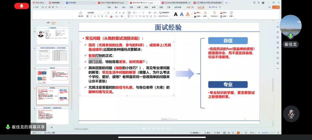 首先,来自天津大学的崔佳龙就考研复试进行经验分享。他主要从复试规划安排、官网文件解读、选择联系导师三个方面进行了详细阐述。他强调要提前了解复试流程和目标院校的工作安排,打好信息战,对于导师的选择,也是一项重要的工作,一定要结合自己的人生目标及研究生规划选择合适的导师和平台。