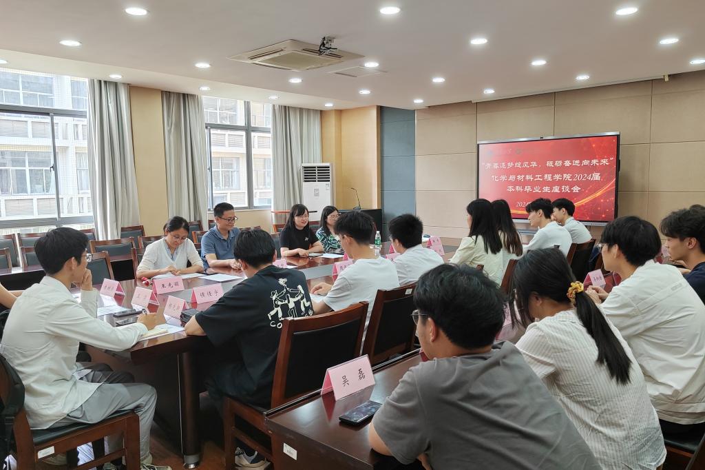 于化工楼A310会议室举办“青春逐梦绽风华,砥砺奋进向未来”2024届本科毕业生座谈会,学院党委副书记、副院长董霞、化工系系主任蒋建中、材料系系主任罗静、应化系教师王光丽以及本科毕业生代表参加座谈会,活动由分团委书记兼学工办主任、2020级本科生辅导员鞠峰主持。