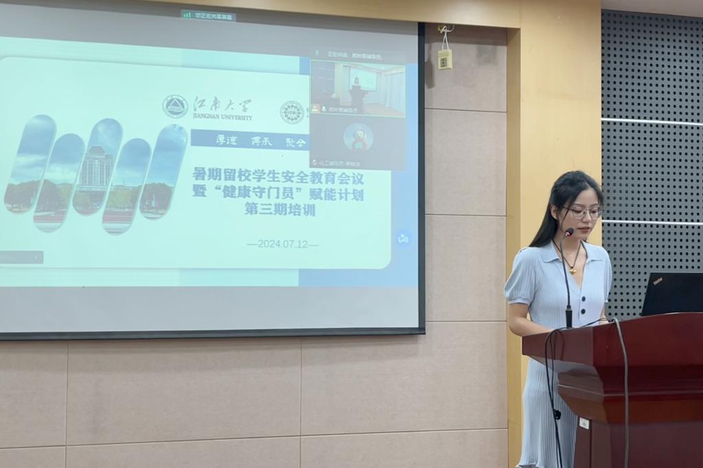 于7月12日在蠡湖、东氿两校区同时开展暑期留校学生安全教育会议暨“健康守门员”赋能计划第三期培训。学院党委副书记、副院长董霞,学工办副主任侯玉莹、各年级辅导员及本研全体“健康守门员”参加本次会议,会议由心理辅导员郝林青主持。