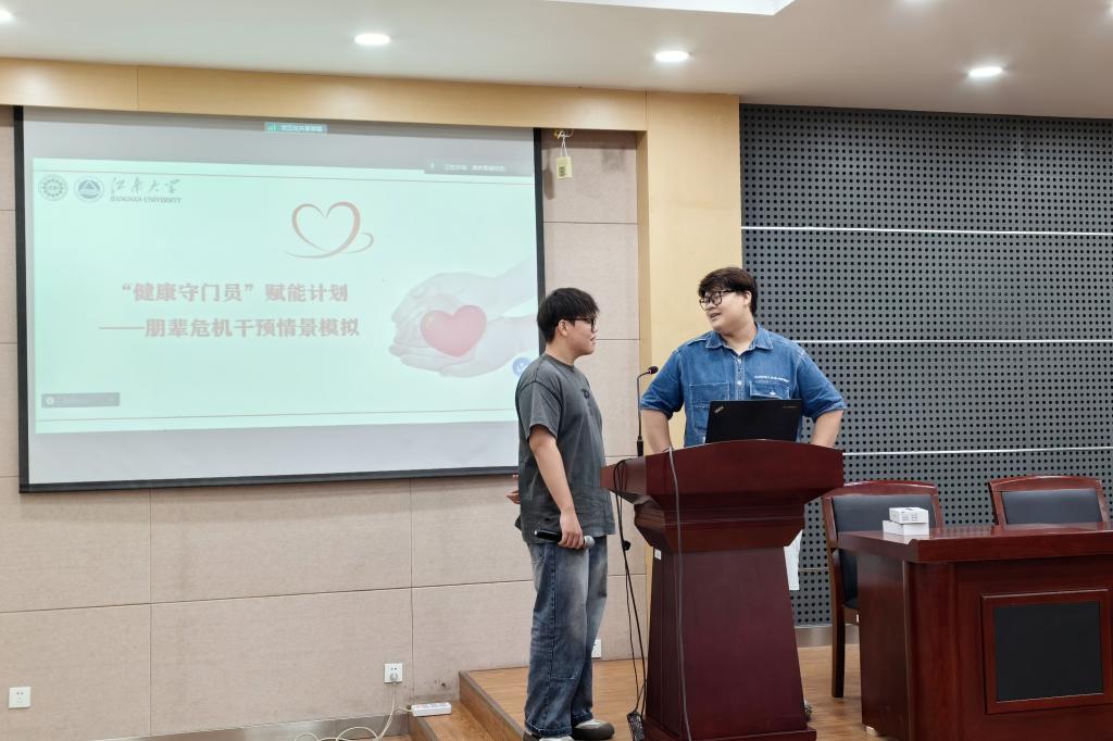 心理健康教育工作站以朋辈危机干预情景模拟为教育形式,邀请两名学生以《考研“蕉绿”了怎么办》为题进行现场模拟对话,为“健康守门员”提供可借鉴的朋辈危机干预技巧。在情景对话中,担任“健康守门员”的学生在发现同伴可能出现心理困扰后,及时关心了解情况,给予力所能及的支持和帮助,并向同伴提供可求助的心理援助渠道。在情景模拟的过程中,担任“健康守门员”的学生还适时与现场观众进行提问互动,引导在场师生共同思考危机干预的有效方法。