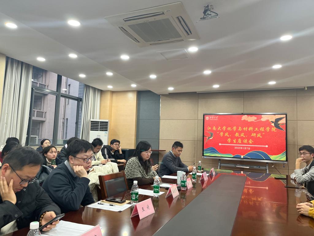 于1月7日在化工楼A310会议室举行本科学生代表座谈会。学院党委副书记兼副院长董霞、副院长王靖、化学工程系系主任董亮亮、材料科学与工程系党支部书记、副系主任杜明亮、应用化学系副主任晏晓东、2021级本科生辅导员郝林青、2024级本科生辅导员马之禾以及30余位本科生代表参加了本次座谈交流。