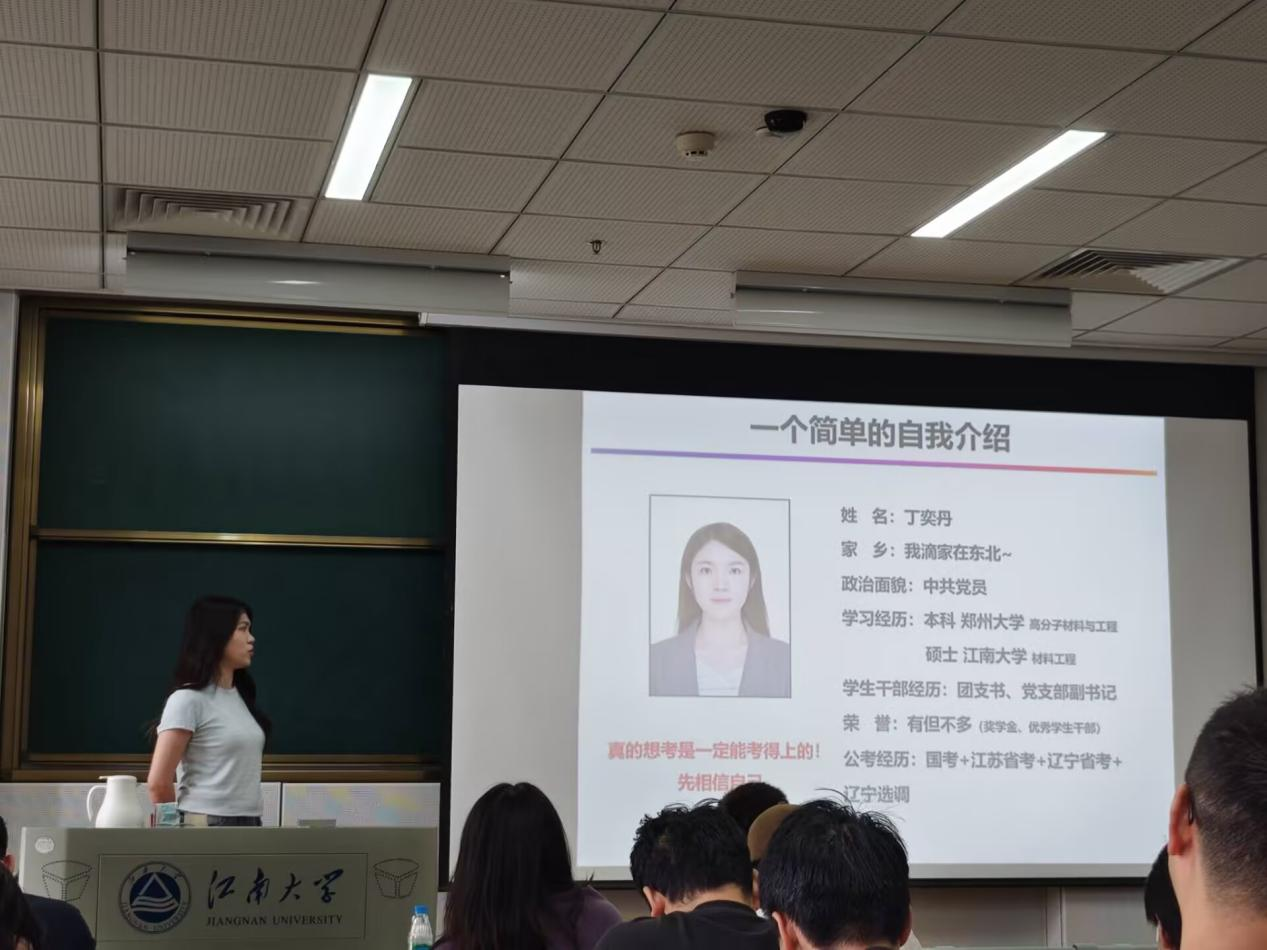 随后,成功上岸的优秀学生代表分享了他们的经验。丁奕丹同学作为辽宁选调生,秉持“事缓则圆,相信自己”的信念,结合自身经历,分享了选调生考试的特点、备考方法以及在备考过程中如何调整心态。从专业科目复习、资料筛选、时间管理等方面展开,结合实际案例,生动形象地展示了如何在激烈的竞争中脱颖而出。鼓励同学们勇敢尝试,积极备考。