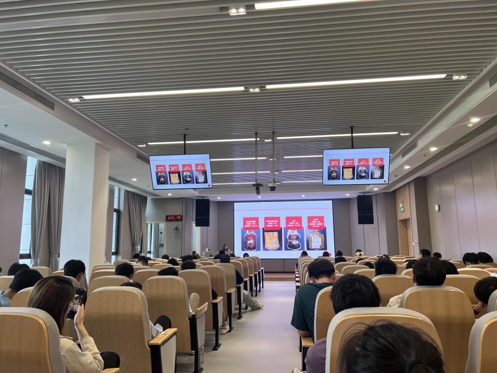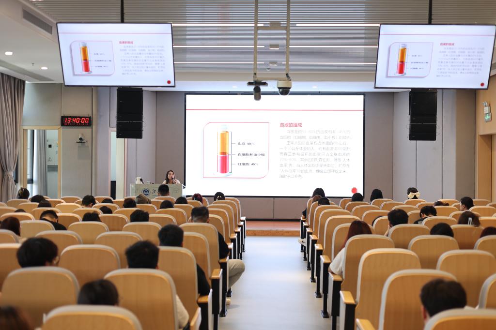 讲座伊始,宜兴市红十字会血站血源管理科副科长许丹为同学们进行了详实的无偿献血知识讲解。她科学阐述了献血对个人健康的益处以及对社会生命救援体系的重要贡献,并通过展示不同血液类型,引导同学们将献血视为关注自身健康与履行社会责任的重要纽带。
