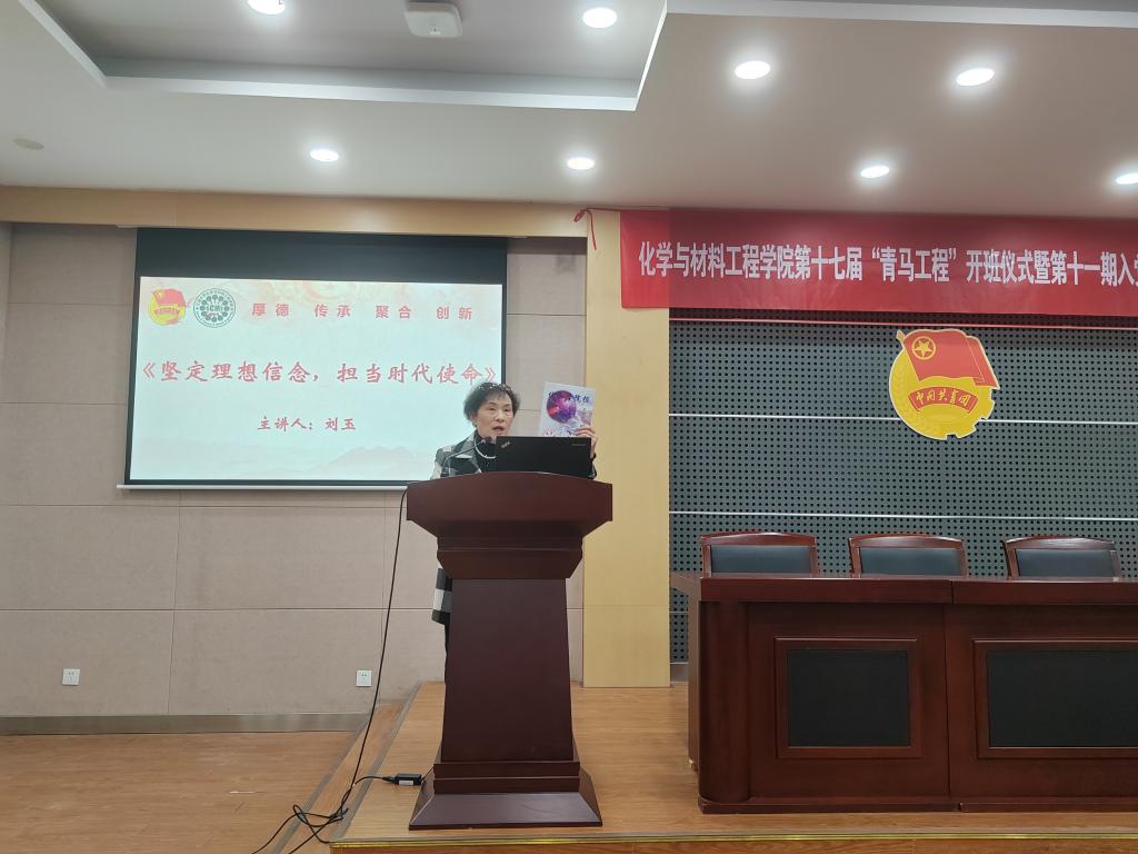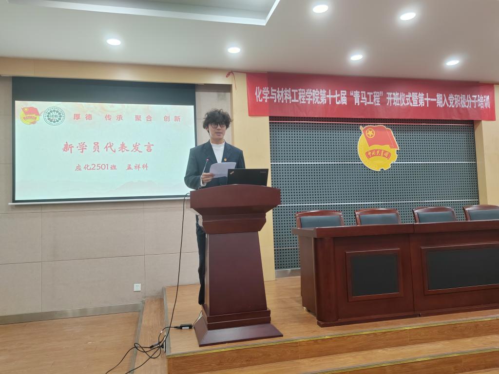 董霞为第十七届“青马工程”培训班授旗,新学员代表应化2501班孟祥科上台发言,表态将以此次培训为契机,潜心钻研、锤炼本领,深耕党的红色基因与精神谱系,做到学思用贯通、知信行统一,以坚定的理想信念、扎实的理论素养,践行青年担当,努力成长为一名信仰坚定、勇担使命的青年马克思主义者。