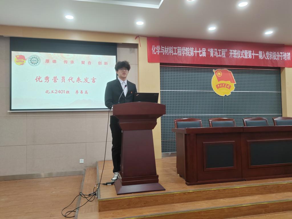 鞠峰宣读第十六届“青马工程”培训班优秀营员表彰决定,并为优秀营员颁发证书,优秀营员代表化工2401班李易高进行发言,分享了在培训班的淬炼成长与深刻体悟,未来将以坚定的信仰锚定前行方向,以务实的态度钻研专业知识,以昂扬的姿态扛起青年使命,在学思践悟中践行马克思主义青年观,不负时代、不负韶华。