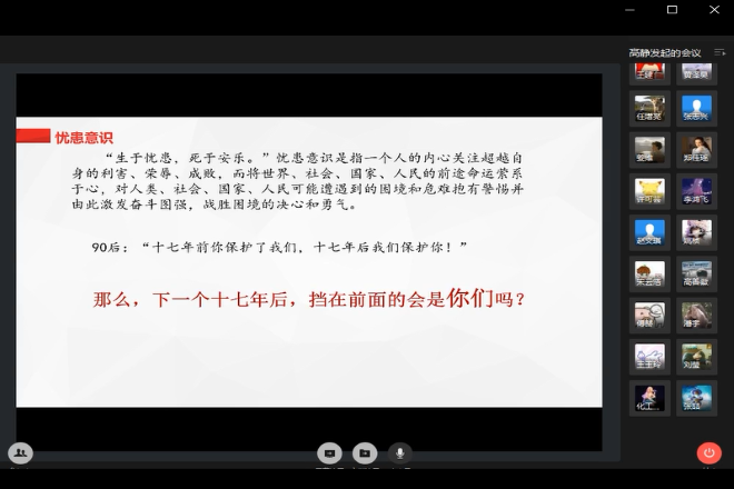 青马训练营第二讲语音会议圆满举行。高静老师受邀参加此次讲课,同时分团委书记任增亮老师、青马训练营的各位学员加入课堂进行学习。