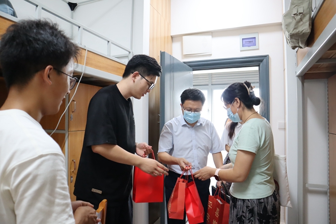 党委书记潘庆伟,院长东为富,党委副书记、副院长田卫平及学院辅导员老师们来到研究生宿舍,看望学院2022级研究生新生。在宿舍走访过程中,学院领导向新生表达节日祝福,深入了解新生对于入住新校区的感受。同时在欢迎仪式上鼓励新生立足新校区,尽快适应研究生生活,充分利用好东氿校区的一流软、硬件设施,静下心来做学问,以优异的科研成果助力东氿校区的建设。各团队老师也来到东氿校区看望学生。