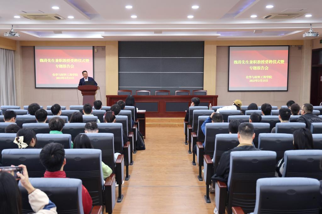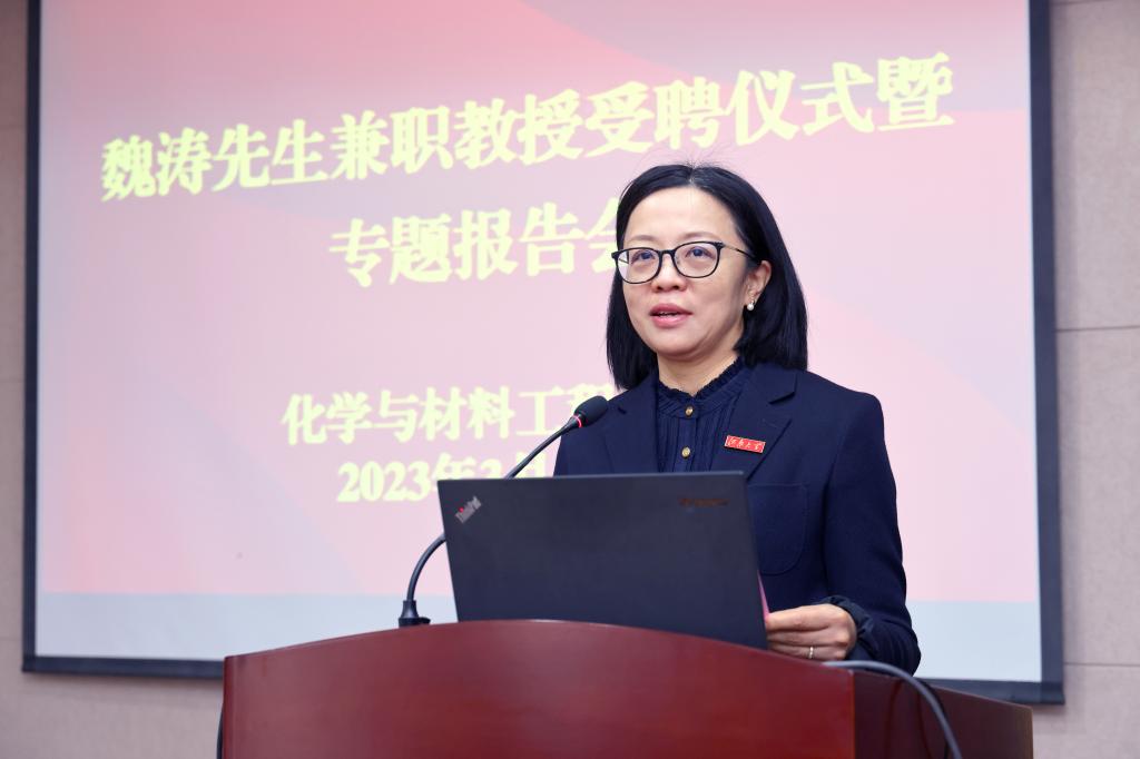 校徽,并为在座师生介绍了魏涛教授的主要学术成就,表达了对魏涛教授到来的热烈欢迎和衷心感谢。