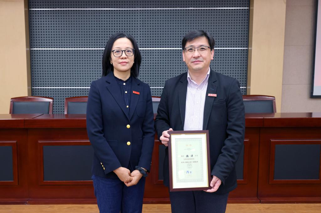 张影陆代表学校为魏涛教授授予了百合动漫