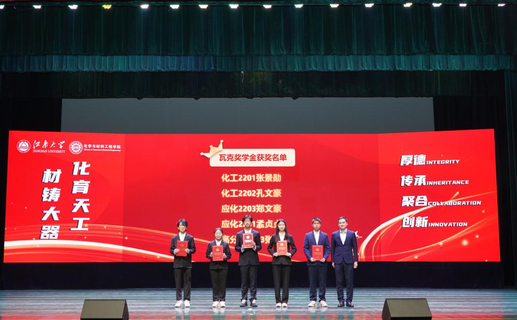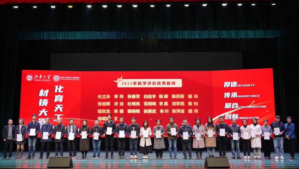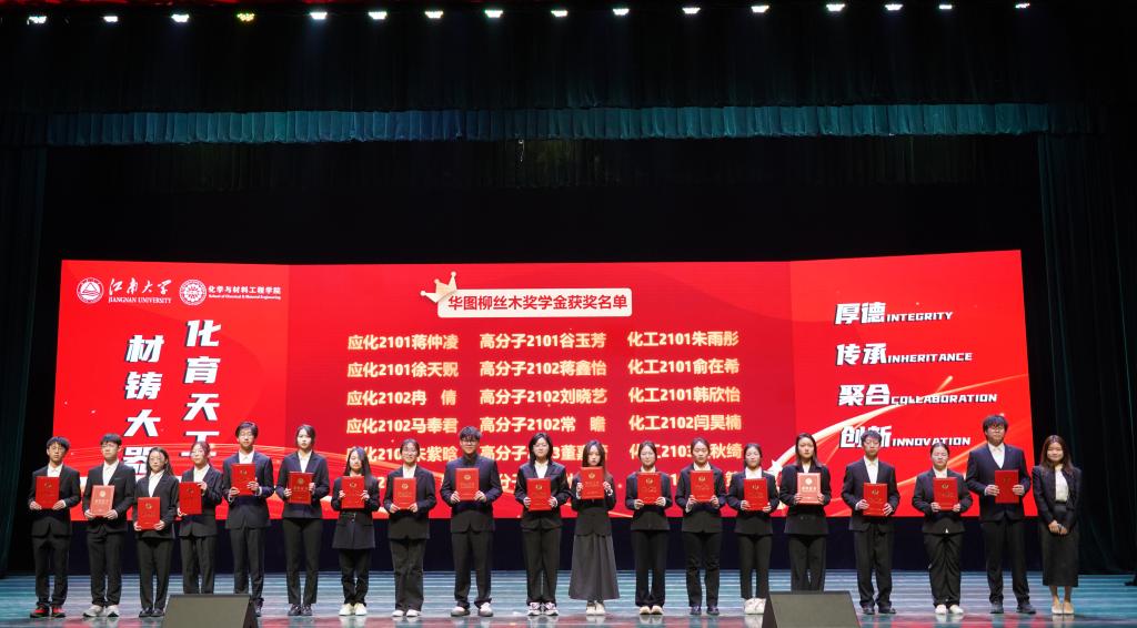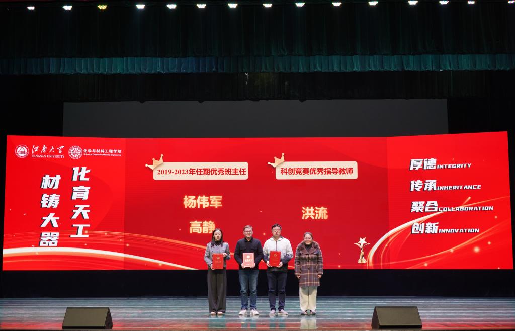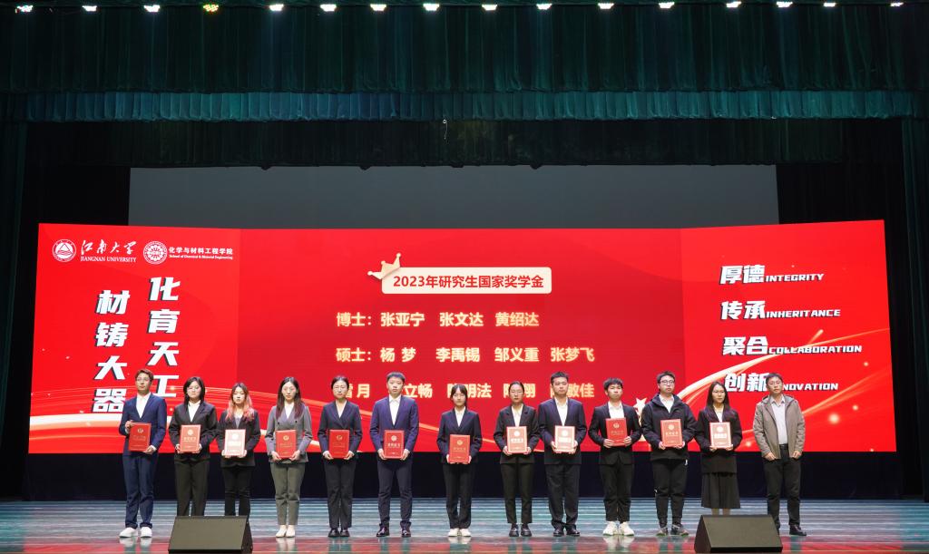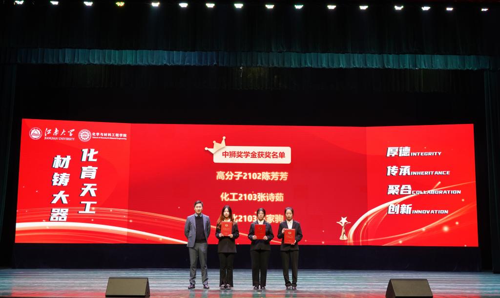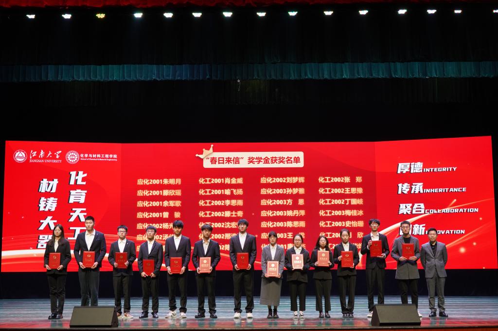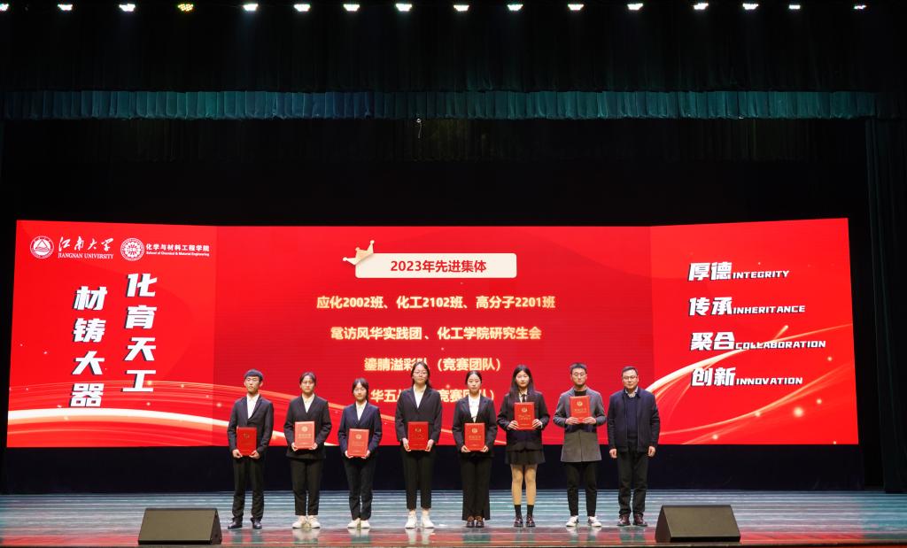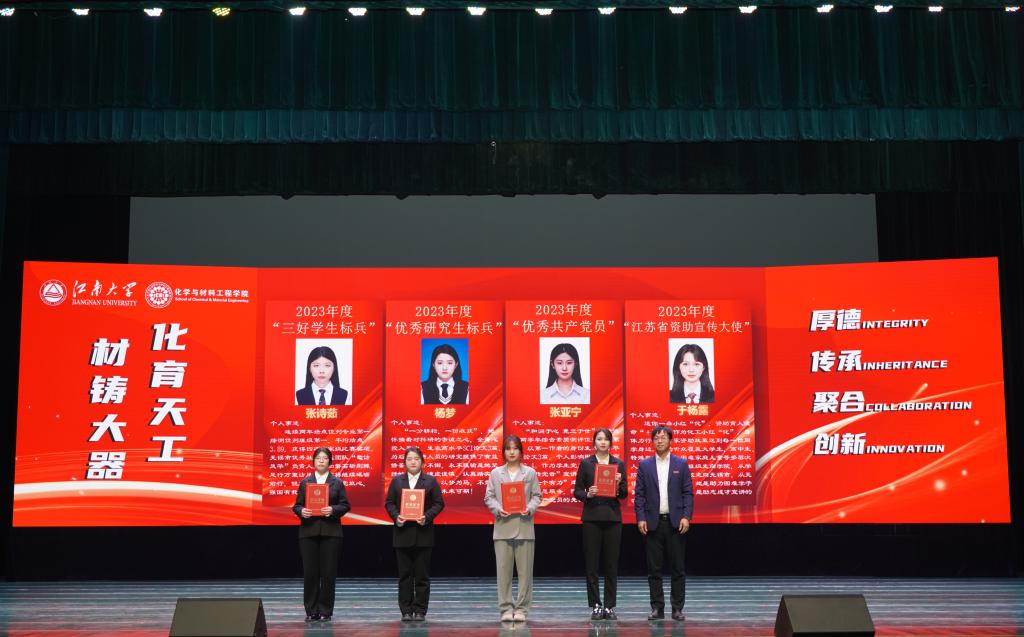 在优秀教师的引领和指导下,化院学子勤奋向学、勇于探索,在学业、科研各领域争当排头兵。大会对2023年度涌现出的学生先进个人和集体进行了表彰。学院党委副书记、副院长董霞、学院副院长王靖宣读先进个人、先进集体及各项企业奖学金获奖名单,此次共有243位同学及7个学生集体获得表彰,学院领导及企业代表为获奖学生颁发荣誉证书,受资助学生为捐资助学企业送上感谢信。学生代表杨梦、姜雨发言。她们结合自身或集体的成长历程,讲述了在院校引导和企业贤达帮助下,实现的一次次突破和跨越,并呼吁广大同学以更加饱满的精神状态和一往无前的奋进姿态启航江南,逐梦江南。