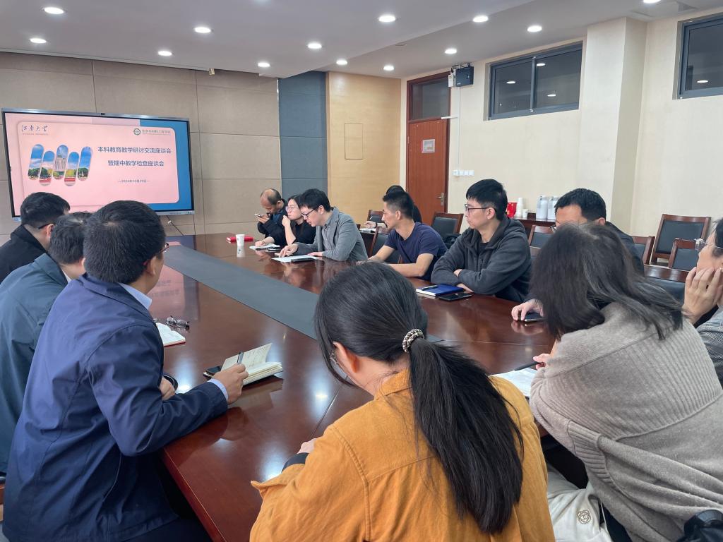 在学院A310会议室召开本学期本科教育教学研讨会暨期中教学检查座谈会。会议由副院长王靖主持,各系主任、教学主任,四大基础化学课程组主任以及学院基层教学组织负责人参会。