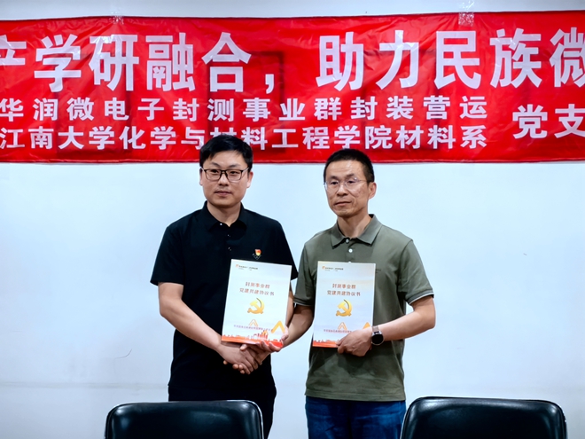 材料系党支部书记杜明亮先后介绍了双方党支部建设情况。华润微电子封测事业群党支部组织委员顾益新宣读《党建共建协议》,明确将以习近平新时代中国特色社会主义思想为指导,通过共建平台、共抓队伍、共享资源、联合攻关等方式,全方位推动院企产学研高质量融合发展。张文飞、杜明亮代表双方签署支部共建协议。未来,双方将共建工作联系小组,建立工作例会制度,在此框架协议的基础上制定共建工作年度规划,拓展活动方案。