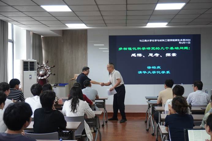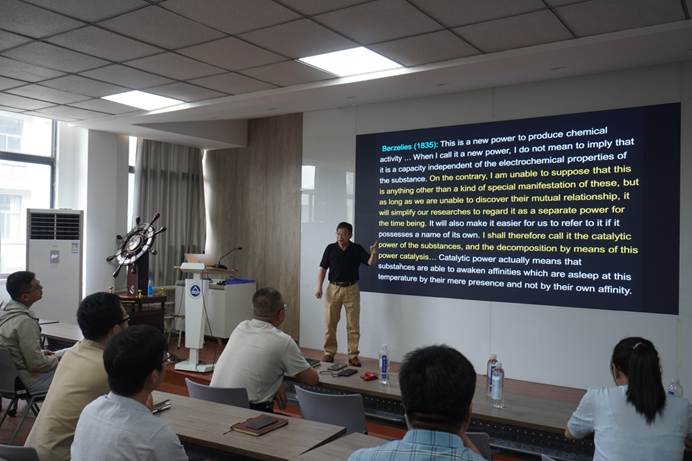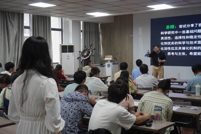 徐柏庆教授从催化科学学科的起源、多相催化中基本概念(包括催化剂及其活性、选择性和稳定性)的准确理解,催化剂优劣的科学与技术面,窥探和解析催化活性位及其催化机制的科学目标感悟、思考与主张。他也与大家分享了自己在原创性科学研究中问题的提出、实证和解决方案建立的思考过程,如2005年他证实在ZrO2载体上合成单离子Au3+活性位用于1,3-丁二烯选择性加氢为丁烯具有高活性(Angew. Chem. Int. Ed., 2005, 44: 7132-7135)。该研究为当今催化热点“单活性位催化”理论模型的提出提供了参考。徐老师教导大家在科学研究中“规范、求真和求实”的重要性,以及举例讲解如何在实验中获得准确的实验信息。他诙谐幽默、言辞犀利,见解独到,演讲过程中金句频出,引起在场师生的深刻共鸣和由衷赞叹,让大家明白了一个优秀科学家应该有什么样的本色,为青年老师和研究生指明了努力的方向和目标!