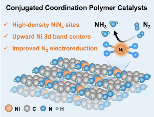 针对上述问题,本工作报道了一种共轭配位聚合物基氮还原催化剂,其具有丰富的金属单原子位点,且这些金属单原子位点的配位结构可灵活调制。在此类共轭配位聚合物催化剂中,共轭有机配体与过渡金属原子之间会形成配位键,其结构中π-d电子离域特征(共轭有机配体π轨道与过渡金属d轨道的杂化)可实现电荷快速迁移,赋予了共轭配位聚合物催化剂良好的导电性。此类共轭配位聚合物催化剂展现出优异的氮还原性能,其法拉第效率可达56.3%,其氨产率可达37.3 μg mg-1h-1。该工作以镍(Ni)单原子为例,合成了具有NiN4和NiO4配位结构的共轭配位聚合物催化剂,并系统研究了其配位结构对氮还原制氨性能的影响规律。理论和实验结果均表明,与NiO4活性位点相比,NiN4活性位点的Ni 3d中心更高,可显著增强其对氮气分子的吸附与活化,可降低其在氮还原反应中的能量势垒,进而实现了氨产率的提升。该工作的研究结果表明了共轭配位聚合物作为一类催化剂在电催化氮还原反应领域具有较大的潜力,也深化了对电催化氮还原反应过程的理解,有望为高性能氮还原催化剂的设计开发提供有益借鉴。