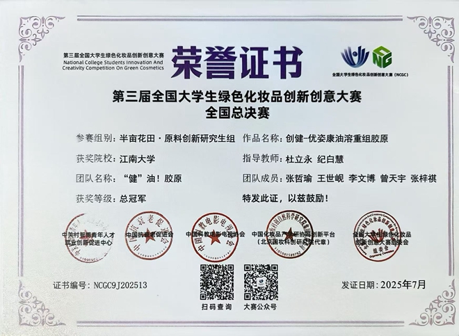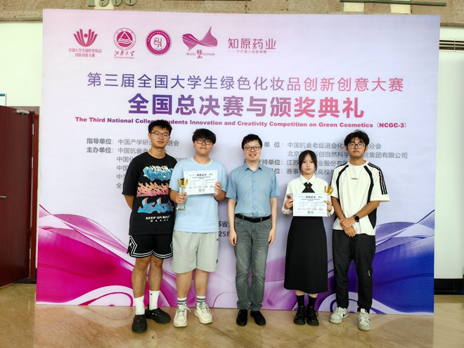四支队伍表现卓越,一举斩获1项总冠军(一等奖第1名)、2项一等奖和1项二等奖的优异成绩,学院也获得优秀组织单位称号。其中,“健”油!胶原团队获得原料创新研究生组总冠军(指导教师:杜立永),江南战“痘”团队获得配方设计大学生组一等奖(指导教师:王靖,晏晓东),专业团队获得配方设计大学生组一等奖(指导教师:王靖,常宽),不长皱纹的橙留香团队获得原料创新大学生组二等奖(指导教师:杜立永,杨井国)。