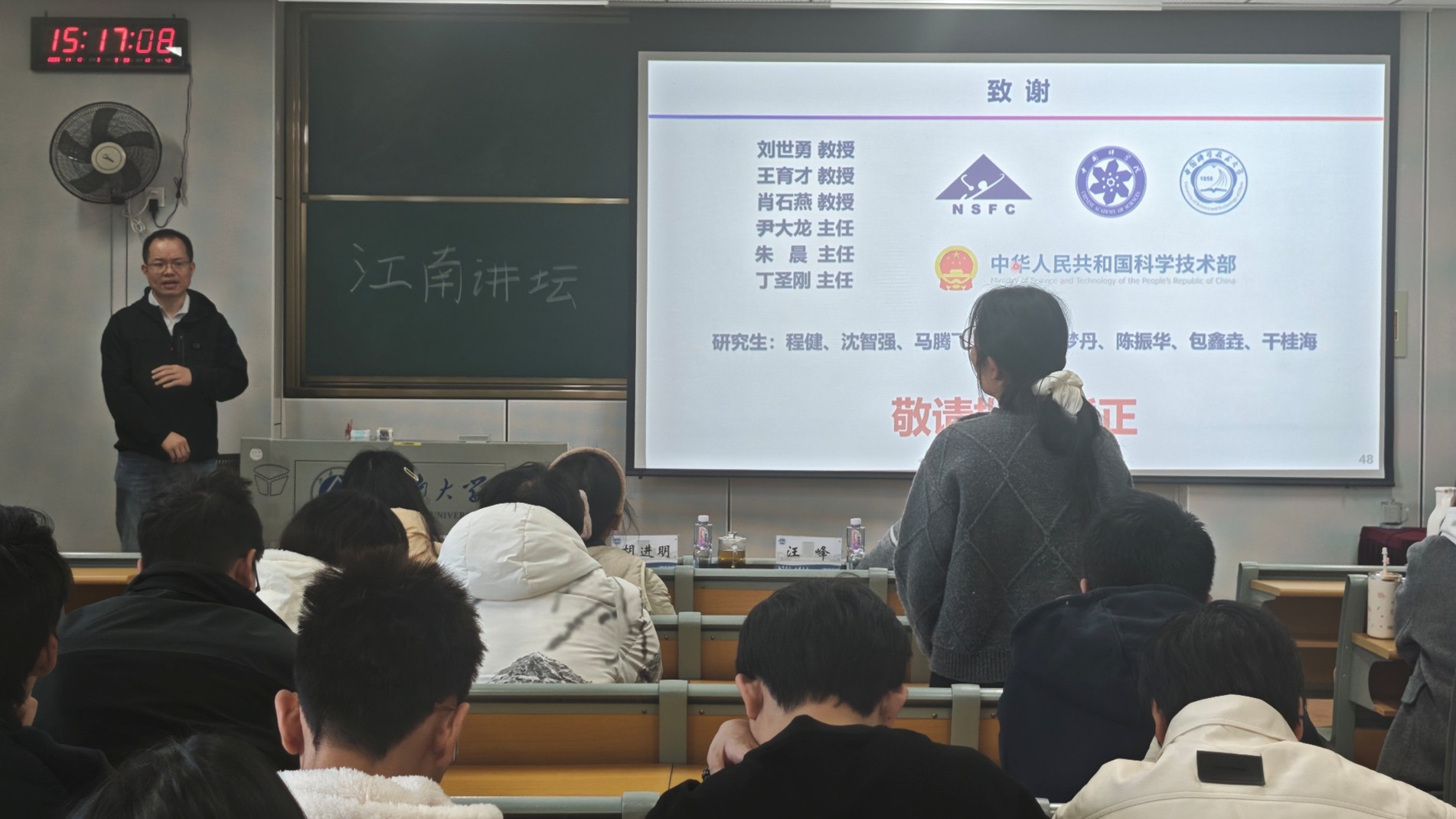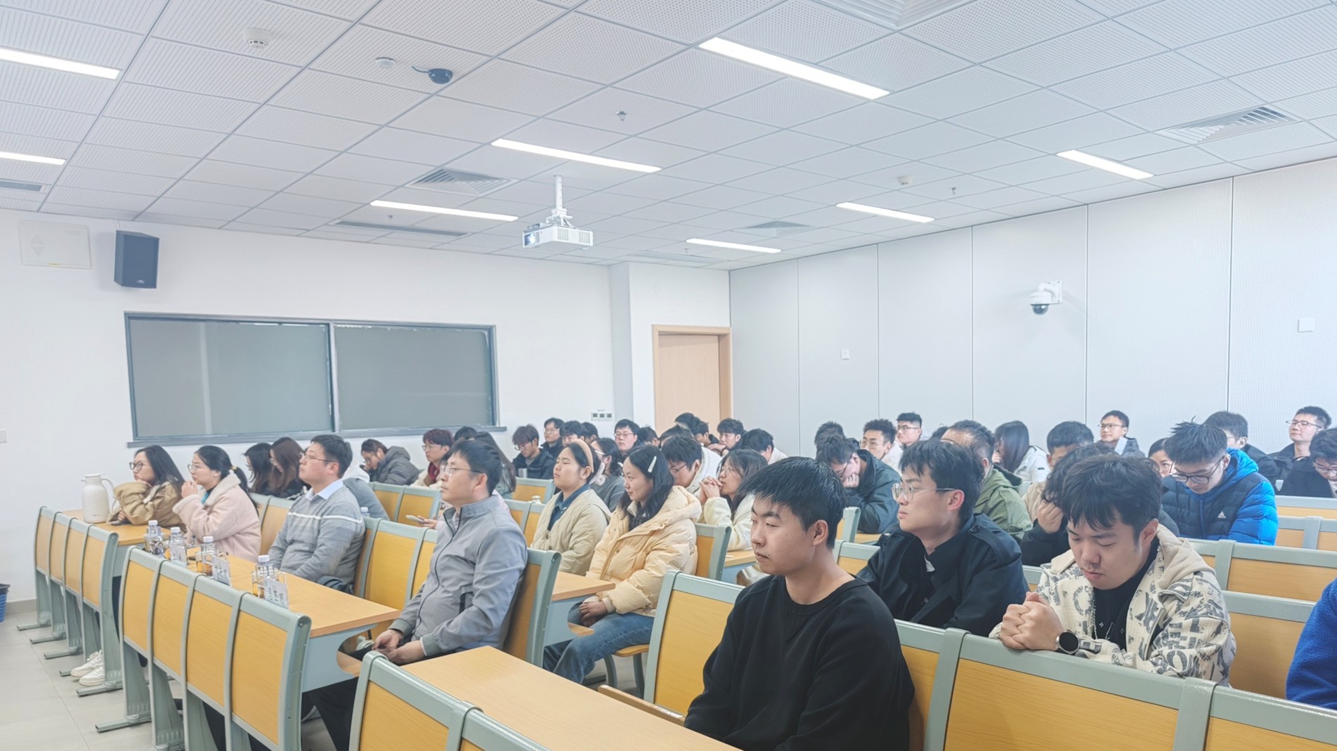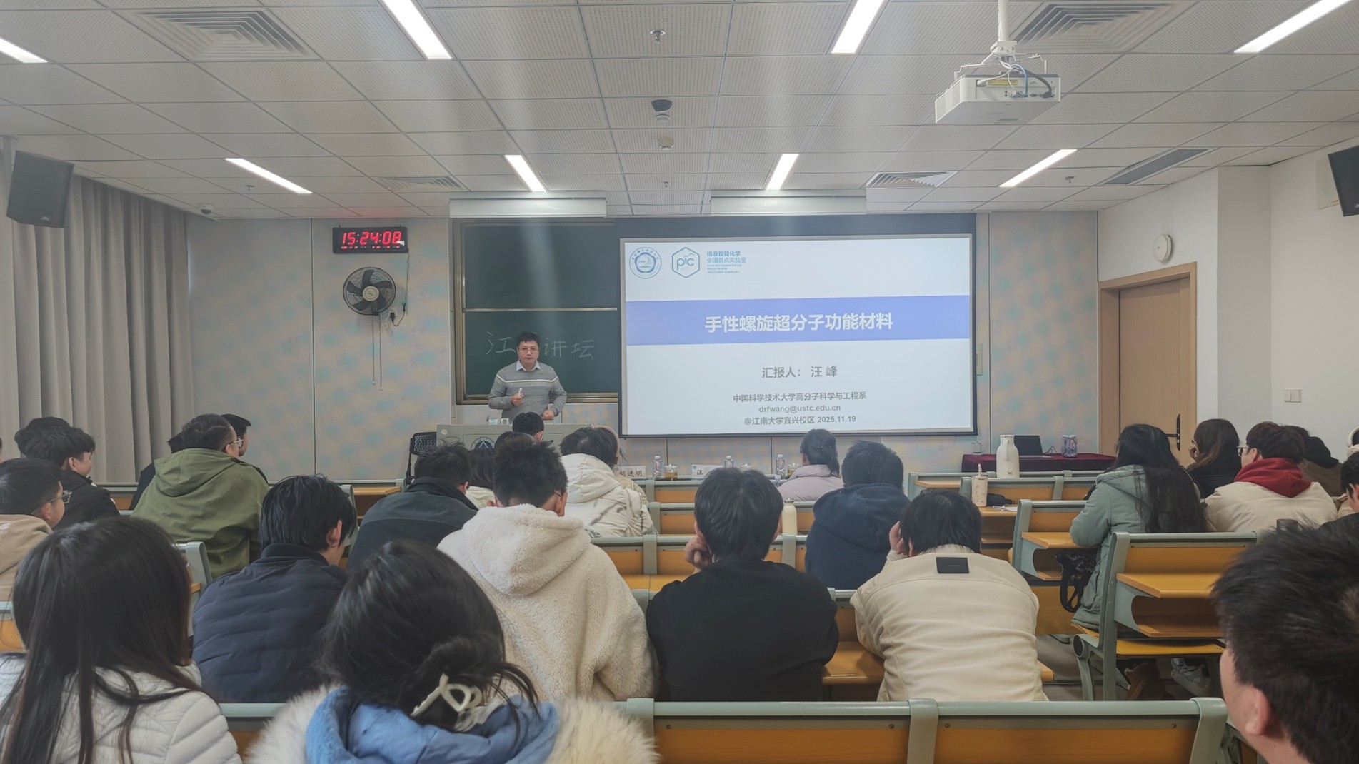 副院长马丕明主持,中国科学技术大学化学与材料科学学院胡进明、汪峰教授主讲,内容涵盖气体药物靶向递送、手性螺旋超分子功能材料等多个前沿领域,现场学术氛围浓厚,与会研究生热情高涨。