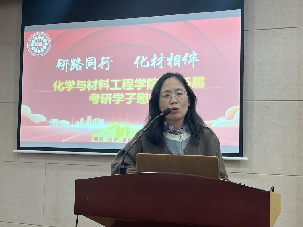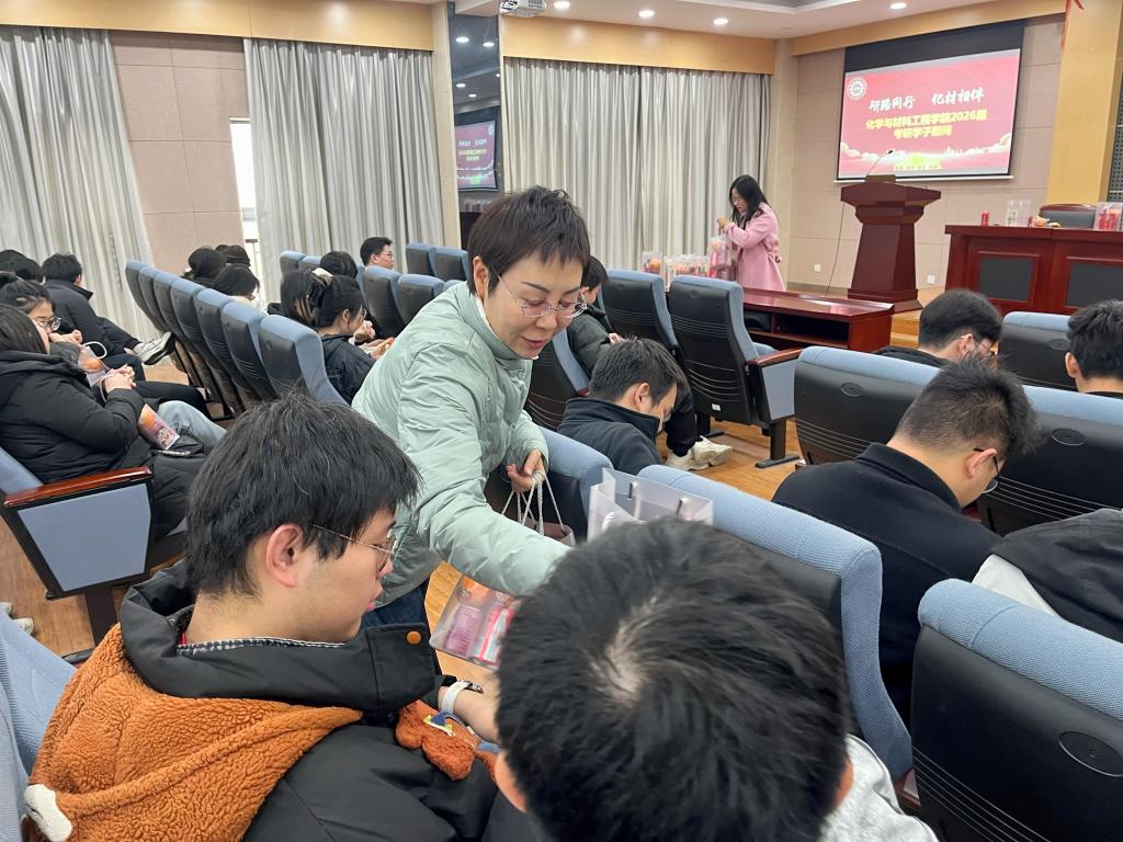 在化工楼B329会议室举办2026届考研学子慰问活动。学院党委书记周雪晖,党委副书记、副院长董霞,毕业生班主任与即将踏上考研初试战场的学子们面对面交流,送上暖心关怀与真挚祝福,为冲刺阶段的考研学子注入强劲动力。本次活动由2026届本科生辅导员杭腾主持。