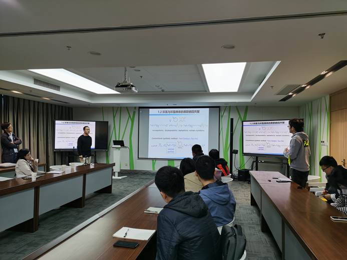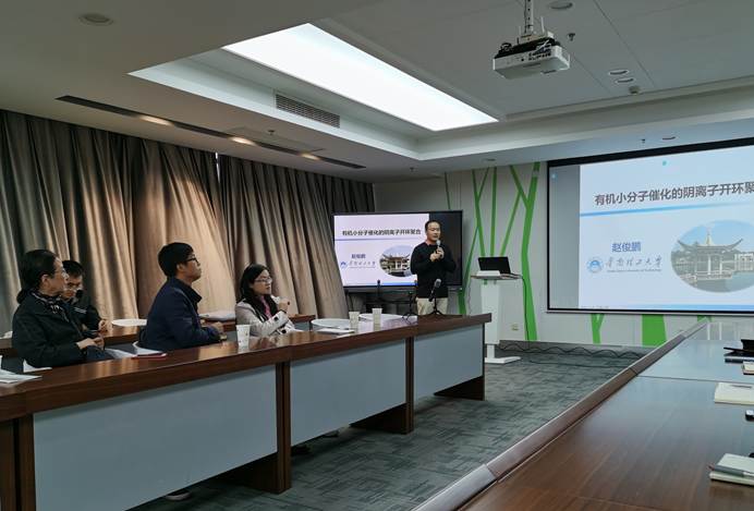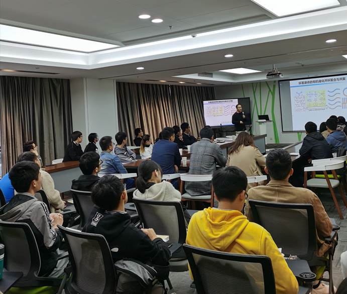刘仁教授主持了该场报告。赵俊鹏教授首先对有机/无金属催化的聚合反应进行简要介绍,指明其在高分子合成方法学科领域的重要价值,随后从单组份(强碱型)有机催化剂和双组份(Lewis酸碱型)有机催化剂两个方面着重讲述了环氧单体的有机催化开环聚合与共聚方法。赵俊鹏教授提到,由于强碱型单组份催化剂的局限性,双组份有机催化剂的应用前景更为广泛。最后,赵俊鹏教授结合目前研究的课题内容,从高效可控的环氧单体开环聚合、环氧与环酯单体的序列可逆串联共聚、环氧与环状酸酐的序列选择性共聚、羧酸酯化聚醚的选择性合成以及双端异官能化聚醚的精巧合成五个方面证实了双组份有机催化剂在环氧单体开环聚合中的优势。报告结束后,赵俊鹏教授与参会老师和学生进行了深入的交流研讨,并对提出的问题作出了详细的解答。