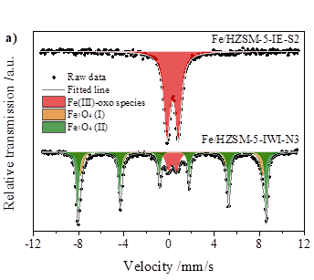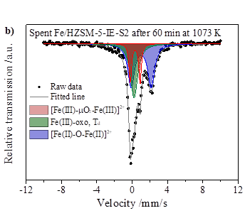 图2.反应前(a)和反应后(b)铁物种表征结果