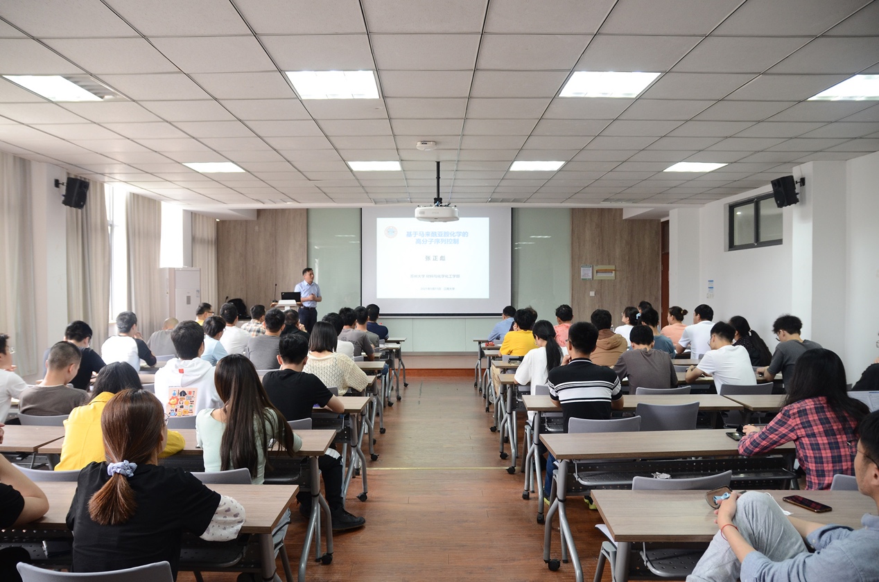 众多师生参加了报告会。张教授着重介绍了近年来基于马来酰亚胺化学的高分子序列调控方面的研究工作,具体分为以下部分:1、利用马来酰亚胺与溶剂的氢键作用构建超分子单体,实现序列的简便调控;2、以呋喃保护的马来酰亚胺作为休眠单体,通过程序改变聚合温度,实现了序列可控高分子的程序化合成;3、将马来酰亚胺基团作为合成子,建立了基于巯基/马来酰亚胺迈克尔加成反应的单一分子量且序列精确高分子的合成路线。最后,张教授重点介绍了此数字高分子在数据存储及防伪领域的应用,引起了在场师生的广泛兴趣和激烈讨论。