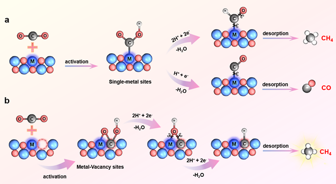 图2:单金属位点和金属-空位对位点光还原CO2路径示意图