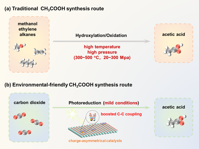 图1:传统制备乙酸的策略和光催化CO2还原制备乙酸的策略示意图